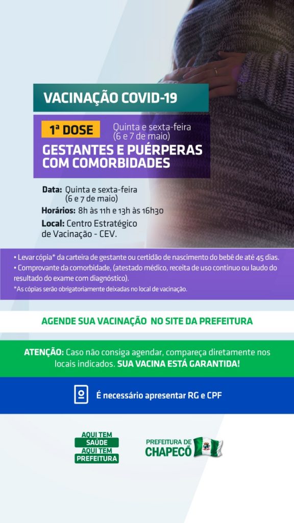 Está aberta a vacinação para gestantes com comorbidades, nesta quinta e sexta-feira (6 e 7), no Centro Estratégico de Vacinação, que fica no hall do Centro de Cultura e Eventos Plinio Arlindo de Nes. A Administração Municipal recomenda o cadastramento no site da Prefeitura (www.chapeco.sc.gov.br). No entanto, quem não conseguir marcar horário, pode ir direto.