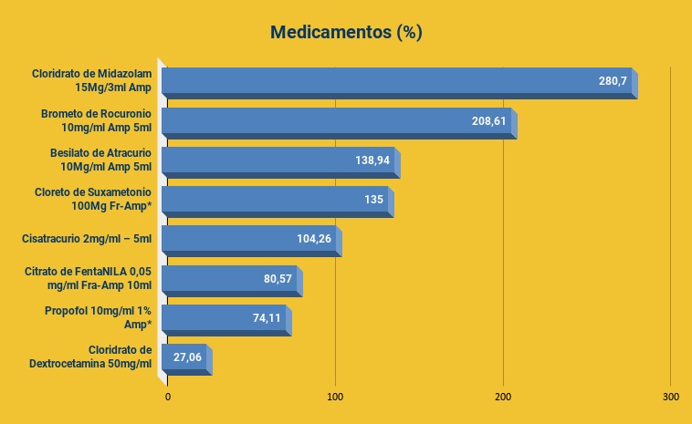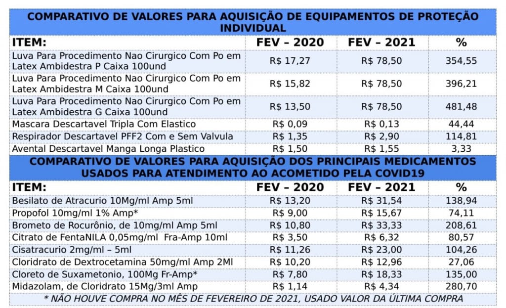 No comparativo de valores para aquisição dos principais medicamentos usados para atendimento aos pacientes Covid, os aumentos passam dos 280%. Um dos exemplos é Cloridrato de Midazolam, (15 mg/3mL, amp), que era comprado por R$ 1,14 em fevereiro de 2020, e agora é comprada por R$ 4,34, um aumento de 280,70%. O Brometo de Rocurônio (10 mg/mL, amp), era adquirido por R$ 10,80, e agora custa R$ 33,33, o que representa uma elevação de 208,61% no valor.