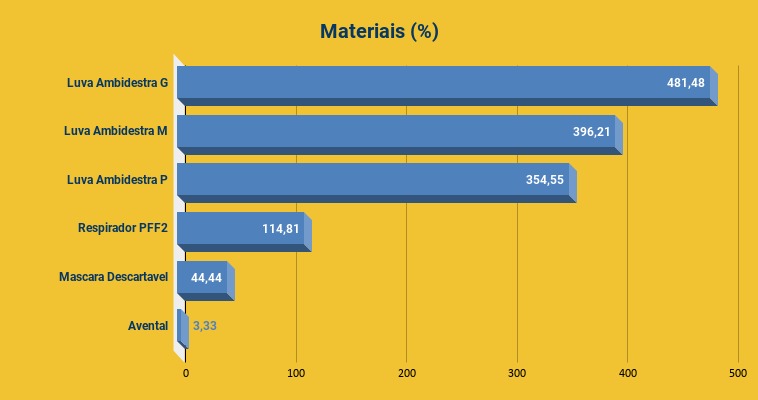 O levantamento relaciona apresenta alguns materiais, como é o caso das luvas de latex, que em fevereiro do ano passado custava R$ 13,50 (a caixa com 100 unidades) e agora, fevereiro de 2021, saltou para R$ 78,50, um aumento de 481,48%.