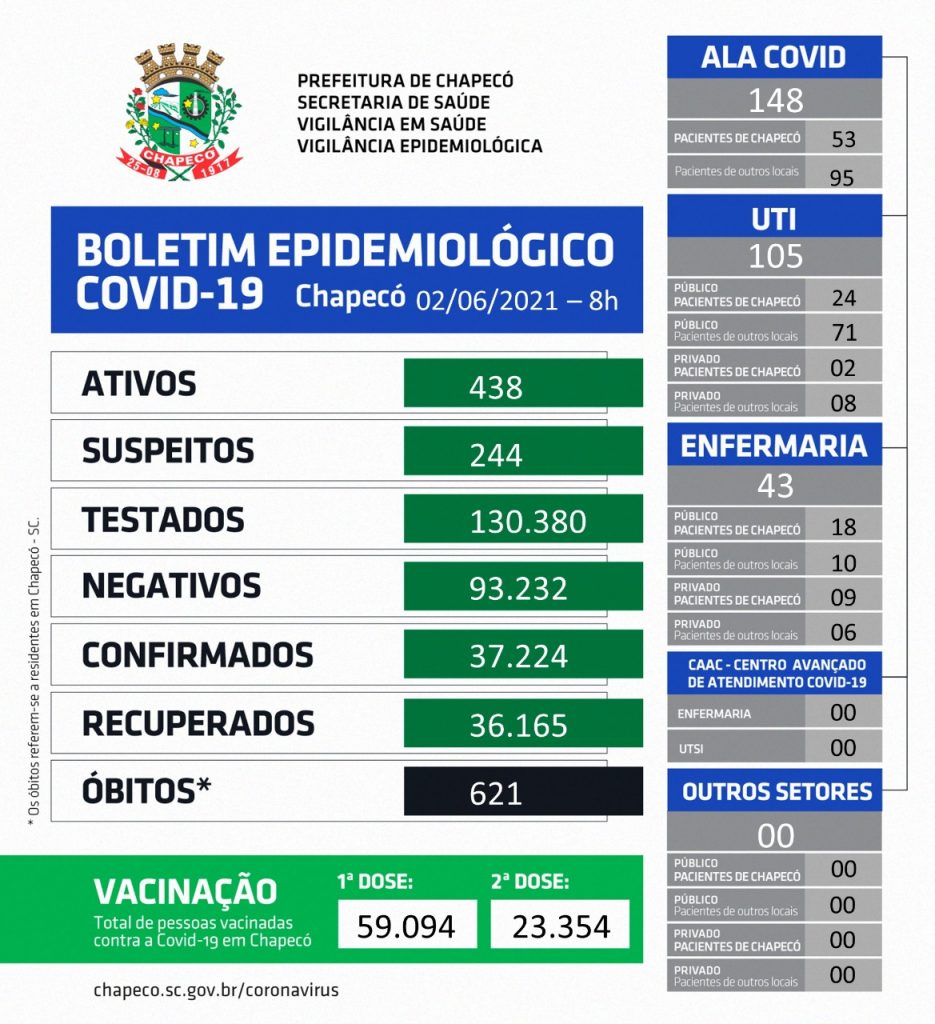 Chapecó contabiliza 621 óbitos desde o início da pandemia de Covid-19. O boletim epidemiológico desta quarta-feira (02) informou o óbito de uma mulher de 61 anos.