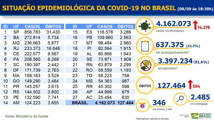 O número total de óbitos chega 127.464, enquanto o número total de casos totaliza 4.162.073. Ainda de acordo com a atualização, 637.735 pessoas estão em acompanhamento e outras 3.397.234 já se recuperaram.