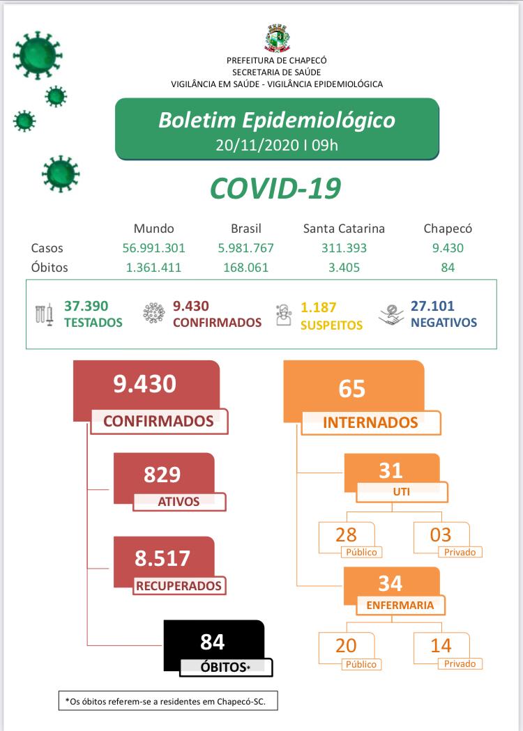 O número de pacientes internados, que era 69 nesta quinta-feira, reduziu para 65 na atualização de sexta-feira. Atualmente, 31 pessoas com diagnóstico ou suspeita da Covid-19, de Chapecó ou outros municípios da região, estão internados em Unidades de Terapia Intensiva (UTI) de unidades hospitalares – 28 na rede pública e três na privada. Na enfermaria, são 34 pessoas – 20 na rede pública e 14 na privada.