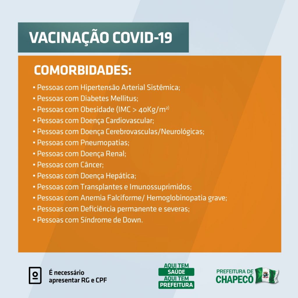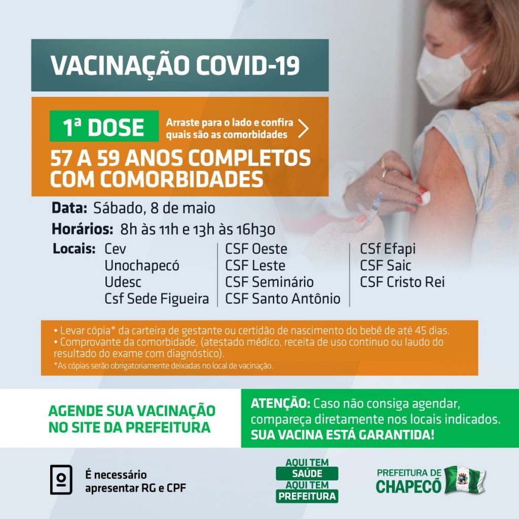 Os locais de atendimento são o Centro Estratégico de Vacinação, no Centro de Eventos, a Unochapecó, Udesc da Sete de Setembro e os Centros de Saúde da Família de Sede Figueira, Oeste, Leste, Seminário, Santo Antônio, Efapi, Saic e Cristo Rei. É necessário levar RG e CPF e, quem tem comorbidades, um documento de comprovação.