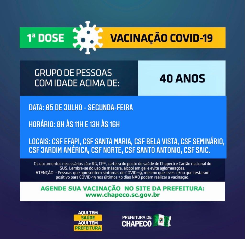 A Vigilância Epidemiológica de Chapecó abriu novo agendamento para quem tem 40 anos ou mais, para a vacinação contra a Covid, na segunda-feira. Os locais são os postos de saúde da Efapi, Santa Maria, Bela Vista, Seminário, Jardim América, Norte, Santo Antônio e Saic.
