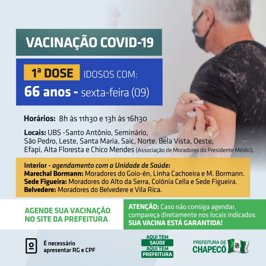 Nesta sexta-feira (9), a vacinação contra a Covid-19 será para quem tem 66 anos completos. O agendamento está disponível no site da Prefeitura (www.chapeco.sc.gov.br). Conforme a Administração Municipal, os postos de saúde que estarão aplicando a imunização são: Santo Antônio, Seminário, São Pedro, Leste, Santa Maria, Saic, Norte, Bela Vista, Oeste, Efapi, Alta Floresta e Chico Mendes (Associação dos Moradores do Presidente Médici). Os horários disponíveis são das 8h às 11h30 e, das 13h às 16h30.