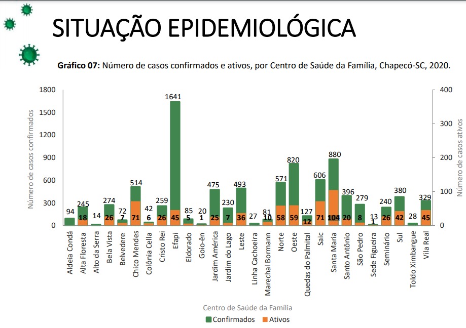 A região do bairro Santa Maria possui o maior número de casos ativos de coronavírus em Chapecó. A unidade de saúde do bairro também é segunda com maior número de casos confirmados, desde o início da pandemia. Dos 880 pacientes diagnosticados na localidade,104 ainda apresentam sintomas. Os dados constam no boletim epidemiológico divulgado nesta sexta-feira (20), pela Administração Municipal. Os dados levam em consideração os diagnósticos feitos até a última quarta-feira (18).