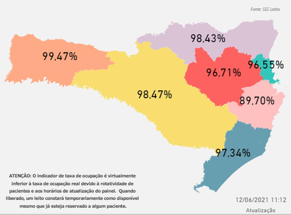 A taxa de ocupação adulto em UTIs é de 96,4% (veja os detalhes por região na foto acima) . O estado tem 24.160 casos ativos.