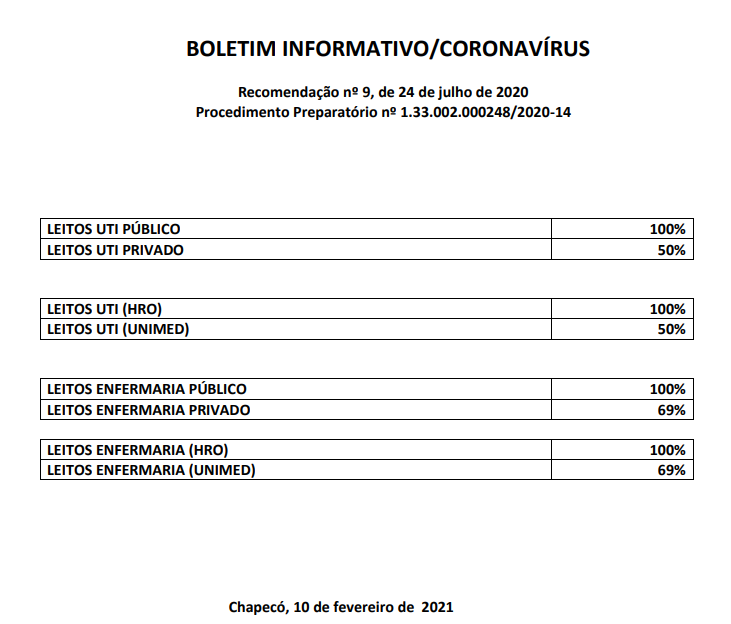A prefeitura possui um contrato com a Unimed, para usar leitos de UTI e enfermaria. No entanto, a Administração informou que esses leitos serão usados quando não houver mais leitos disponíveis nos hospitais públicos de Santa Catarina. Ou seja, é uma medida para ser usada se houver a lotação total dos leitos na rede pública.