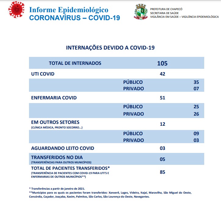 A Administração Municipal informou que os pacientes foram levados para Xanxerê, Lages, Videira, Itajaí, Maravilha, São Miguel do Oeste, Concórdia, Caçador, Joaçaba, Xaxim, Palmitos, São Carlos, São Lourenço e Navegantes.