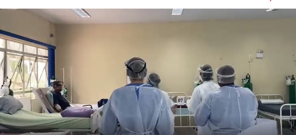 Uma equipe de profissionais de saúde – composta por dois médicos, enfermeira, sete técnicos e dois fisioterapeutas – fez uma homenagem aos pacientes neste domingo (21). A equipe cantou para os internados na Enfermaria 1 do Centro Avançado de Atendimento Covid – estrutura montada dentro do Centro de Eventos, em Chapecó (SC).