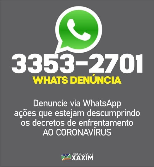 A Administração Municipal de Xaxim disponibiliza para a população um número de WhatsApp onde podem ser feitas denúncias de descumprimento das ações de enfrentamento ao coronavírus. Segundo a prefeitura, o número serve para denúncias de aglomerações e demais atos de descumprimento das ações de enfrentamento ao coronavírus.