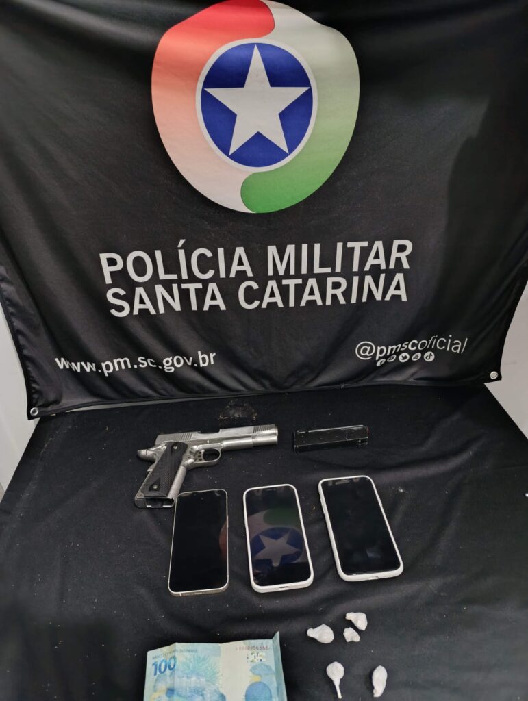 Na abordagem, foram encontradas cinco porções de cocaína em posse da mulher. Em seguida, a guarnição deslocou-se até a residência do homem, onde foi localizado um simulacro de arma de fogo no quarto de um amigo que divide o apartamento com o suspeito.