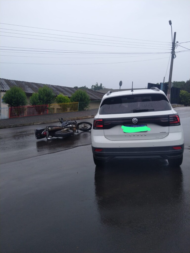 Um acidente de trânsito do tipo colisão lateral entre um veículo de passeio e uma motocicleta foi registrado na manhã de sexta-feira (12), às 11h48min, na Rua Joaçaba, no município de Quilombo, no Oeste de Santa Catarina. O motociclista, um homem maior de idade, sofreu um ferimento abrasivo no antebraço e foi conduzido ao Hospital São Bernardo. A condutora do carro não apresentou lesões aparentes e recusou atendimento médico.
