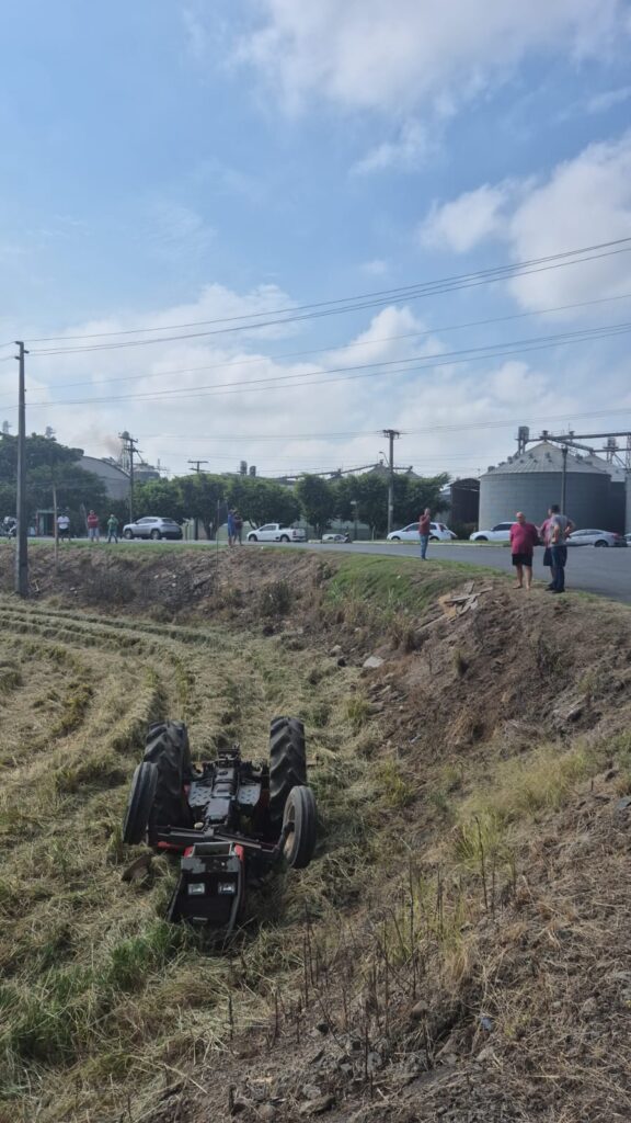 De acordo com as informações repassadas pelas equipes de atendimento, o veículo, um trator de rodas modelo Massey Ferguson ano 1975, saiu da pista e capotou, parando em uma granja de arroz às margens da rodovia, com as rodas viradas para cima.