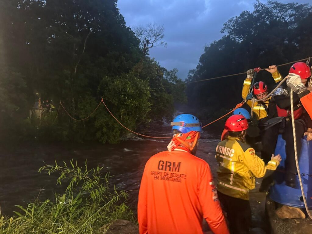Para a travessia, foi utilizado um cabo de aço já existente no local, onde os socorristas montaram um sistema de “vai e vem” para realizar a retirada das vítimas. As pessoas foram transpostas uma a uma, equipadas com capacete e colete salva-vidas.