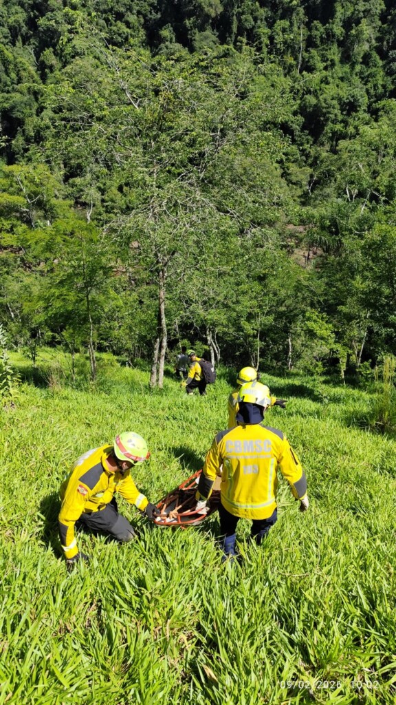 Um homem de 49 anos foi resgatado pelo Corpo de Bombeiros Militar de Santa Catarina na manhã desta segunda-feira (9) após sofrer uma fratura na perna em uma trilha às margens do Rio Chapecozinho, em Xanxerê, no Oeste Catarinense. O acidente ocorreu a aproximadamente 2,3 km da estrada principal, em local de difícil acesso e com desnível de cerca de 200 metros.