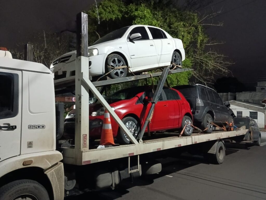 O caminhão de grande porte transportava quatro automóveis. Durante a verificação, os policiais identificaram que um dos veículos embarcados possuía registro ativo de furto/roubo, o que configura crime previsto no Artigo 180 do Código Penal — receptação.