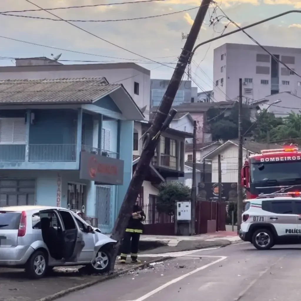 A ocorrência contou com atendimento da Polícia Militar, dos Bombeiros Voluntários e da Celesc. Com o impacto da batida, o poste ficou suspenso e passou a ser sustentado apenas pela fiação elétrica, situação que exigiu a substituição da estrutura pela equipe da companhia de energia.