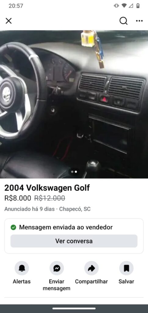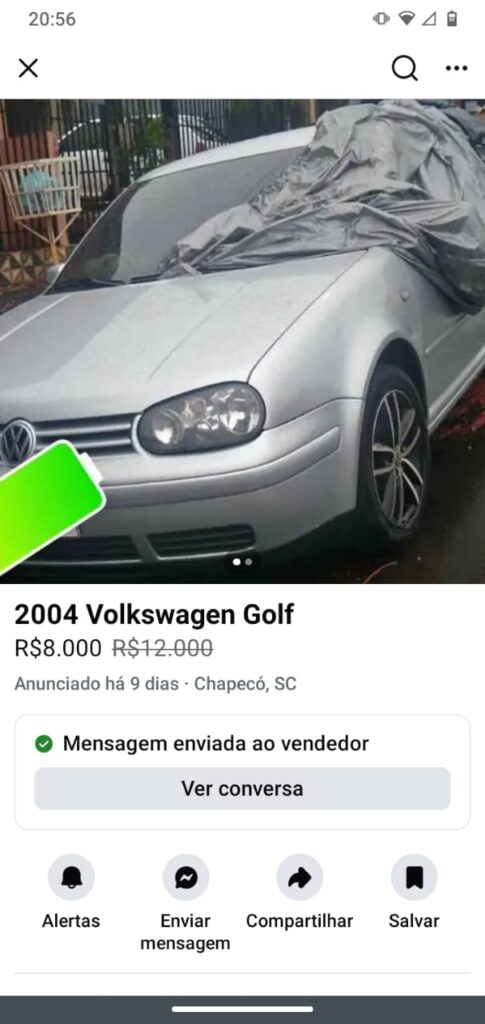Um Volkswagen Golf prata, furtado em plena luz do dia no Loteamento Califórnia, no bairro Efapi, em Chapecó, no Oeste de Santa Catarina, passou a ser anunciado para venda no Facebook Marketplace. O veículo, de placas DHP4B95, pertence a uma moradora da cidade que segue em busca de informações para recuperar o automóvel.