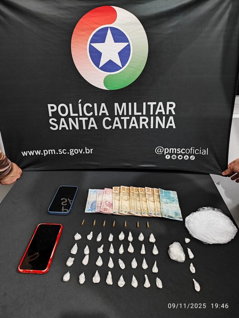 A ação teve início após denúncias que apontavam a comercialização de entorpecentes em uma residência do bairro. No local, os policiais encontraram 50 gramas de cocaína, 36 buchas da mesma substância já fracionadas para venda, uma embalagem com mais 15 gramas de cocaína, munições calibre .22 e uma quantia em dinheiro.