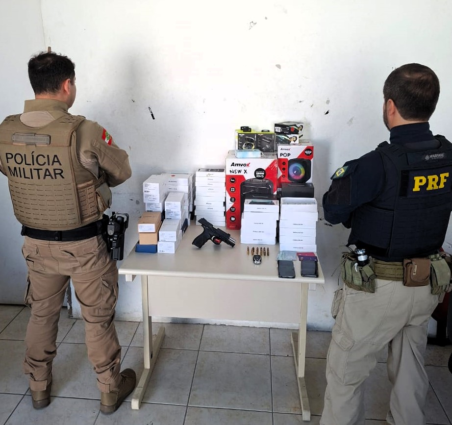 O trio foi interceptado durante uma ação integrada entre a Polícia Rodoviária Federal e a Polícia Militar de SC. Além dos 67 celulares recuperados, os policiais encontraram com o grupo uma pistola calibre .380 com 18 munições.