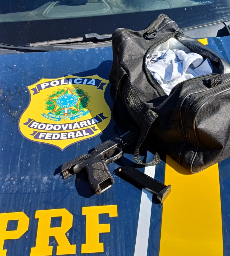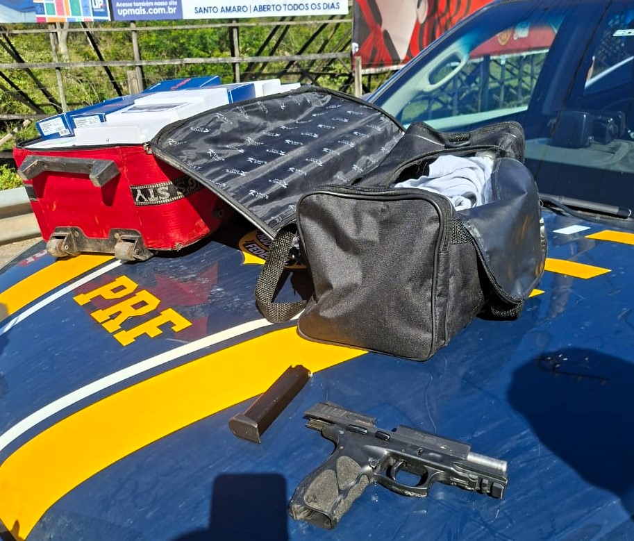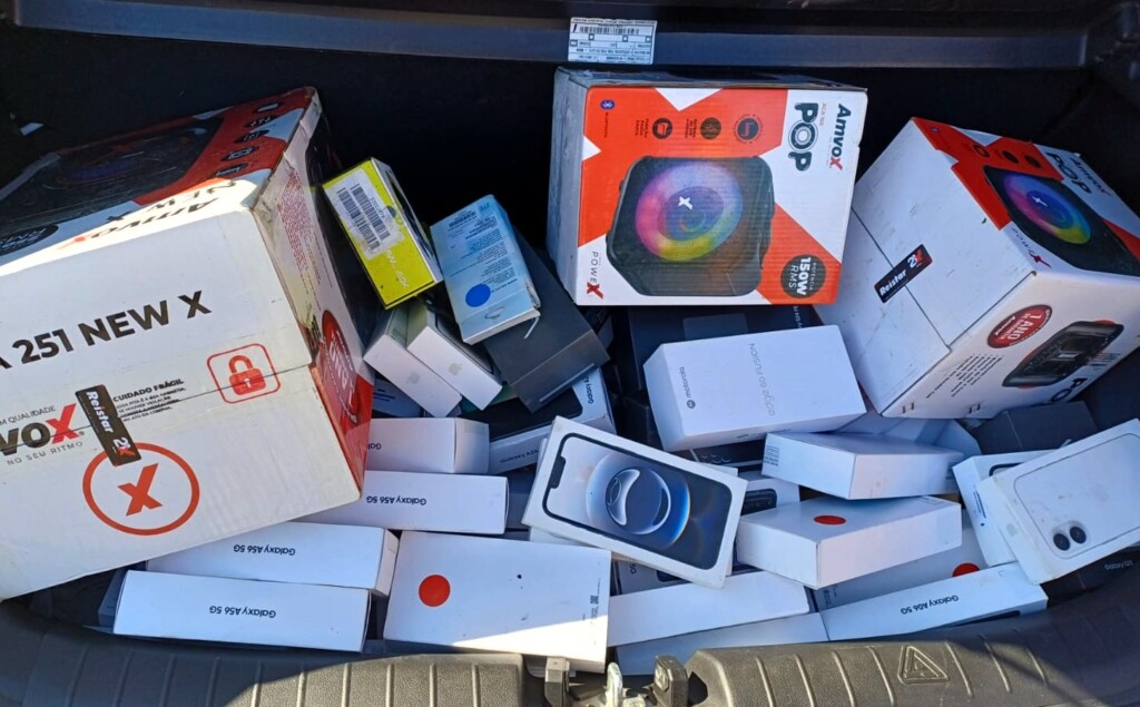 No veículo, os agentes localizaram celulares, um modem, cinco fones de ouvido sem fio e três caixas de som portáteis. Também foi apreendida uma pistola calibre .380, municiada.