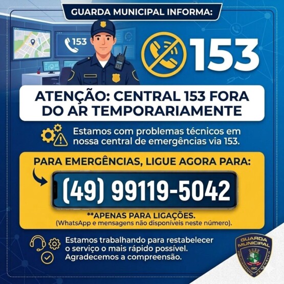 A central de emergências 153 da Guarda Municipal de Chapecó, no Oeste de Santa Catarina, está temporariamente fora do ar devido a problemas técnicos. Para garantir o atendimento à população, foi disponibilizado um número alternativo para chamadas imediatas: (49) 99119-5042. Segundo o comunicado oficial divulgado nesta terça-feira (17), o telefone provisório atende exclusivamente ligações, não sendo possível o envio de mensagens de texto ou contato via WhatsApp. A orientação é que moradores utilizem apenas chamadas telefônicas em situações de urgência.