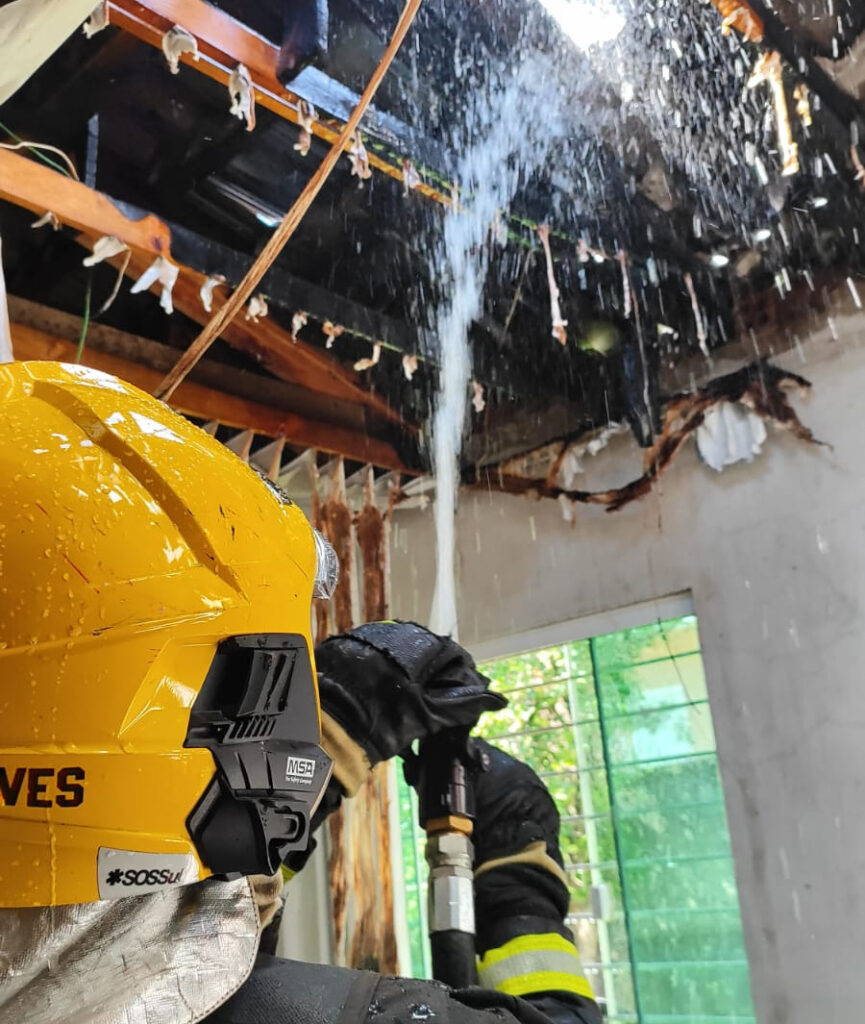 Quando os bombeiros chegaram, não havia mais focos ativos, apenas pontos quentes e risco de reignição. Foi realizado o resfriamento do telhado e do forro atingidos, além da verificação detalhada para evitar novos focos. Aproximadamente 500 litros de água foram utilizados nas ações de combate e rescaldo.