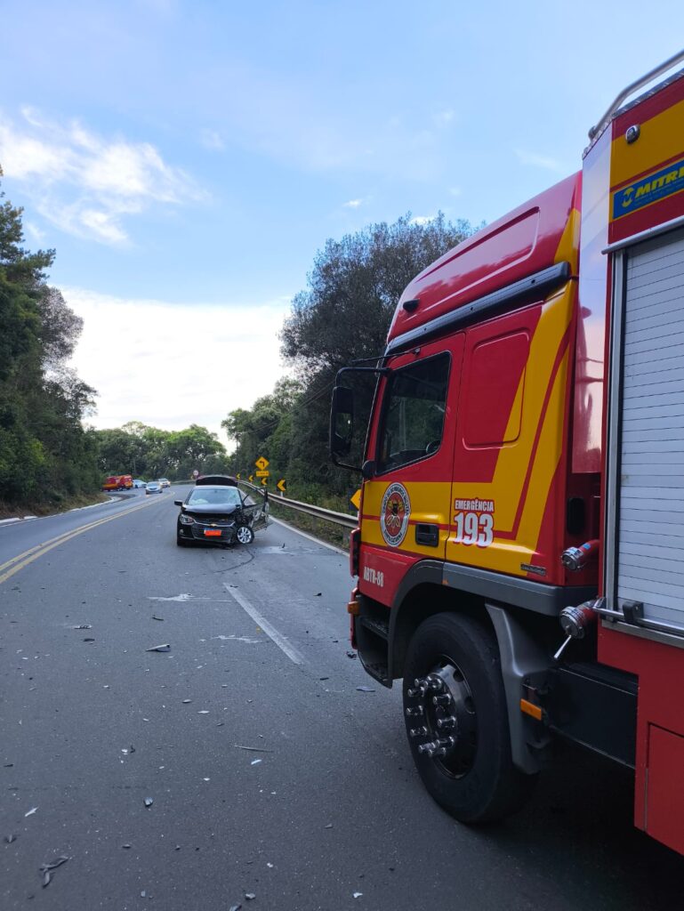 Um acidente entre um carro de passeio e um caminhão mobilizou equipes do Corpo de Bombeiros Militar e do SAMU na manhã desta segunda-feira (16), na BR-282, entre Ponte Serrada e o Trevão do Irani. A ocorrência foi registrada por volta das 7h06, na localidade conhecida como Curva da Santa, em Ponte Serrada.