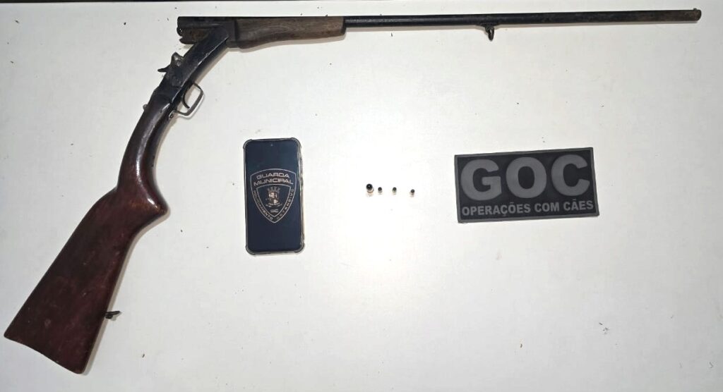 Ao chegar ao endereço informado, os agentes localizaram diversos estojos de munição deflagrada na área externa da residência. O morador abriu a porta para a guarnição e apresentava sinais de embriaguez. Logo na entrada, os guardas visualizaram uma espingarda encostada na parede do imóvel.