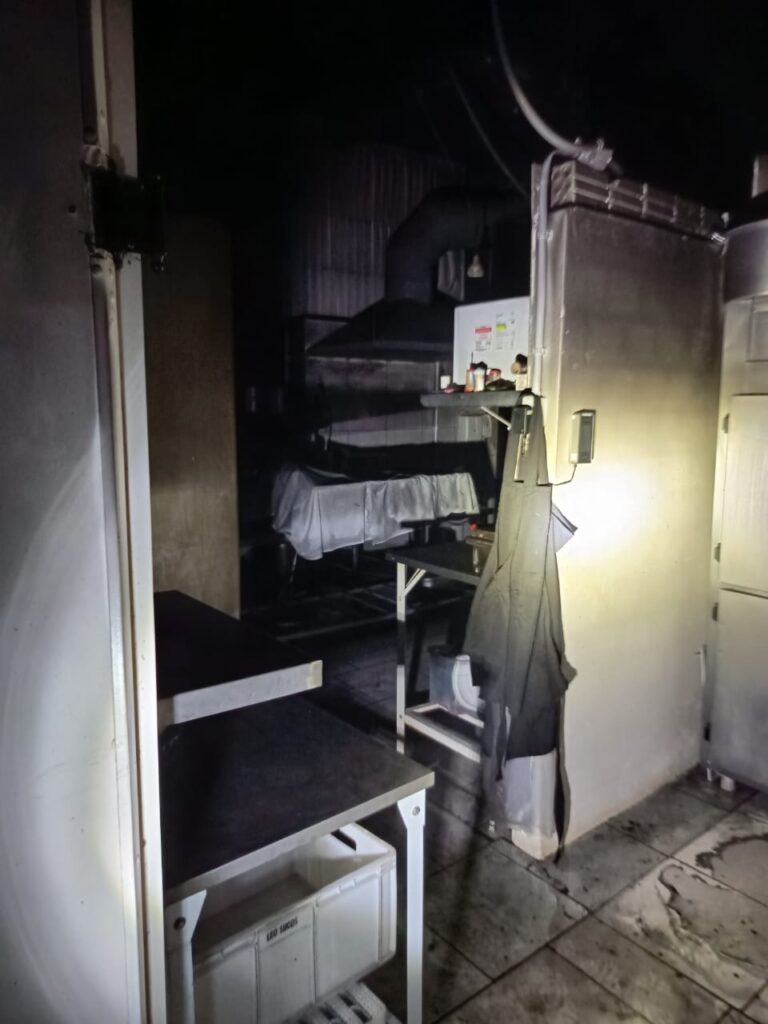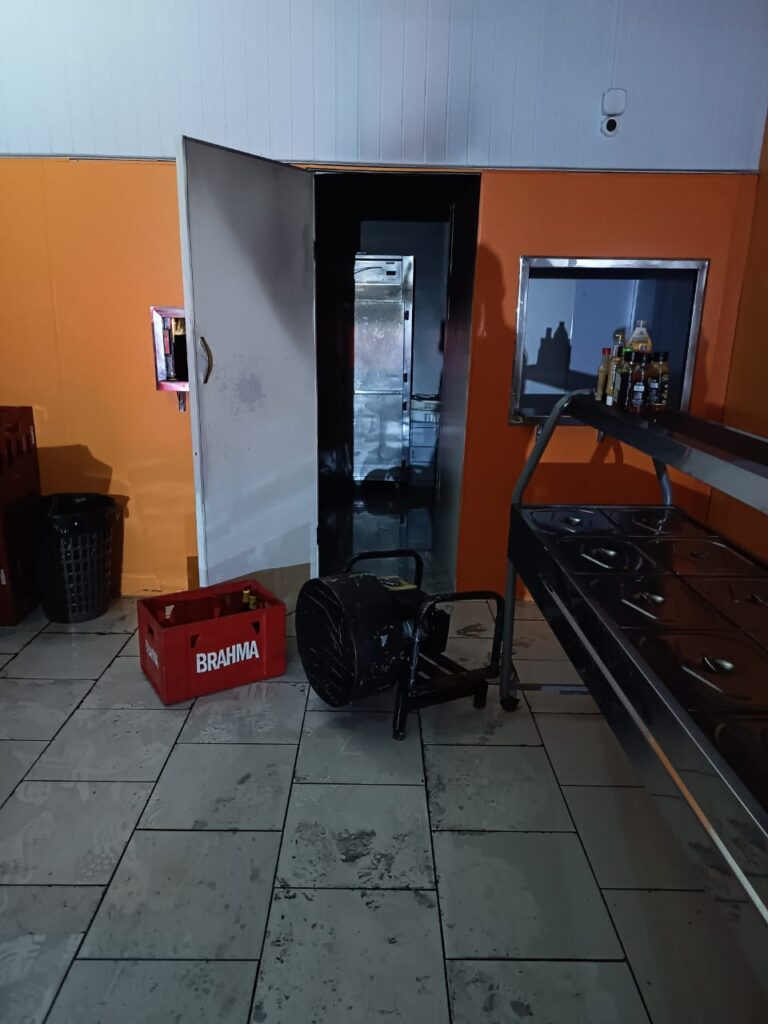 No momento da chegada da equipe, a energia elétrica do imóvel já estava desligada. A guarnição realizou o corte do fornecimento de Gás Liquefeito de Petróleo (GLP) para garantir a segurança da operação. O acesso ao interior do restaurante ocorreu pela porta dos fundos, com progressão em plano neutro abaixo de um metro.