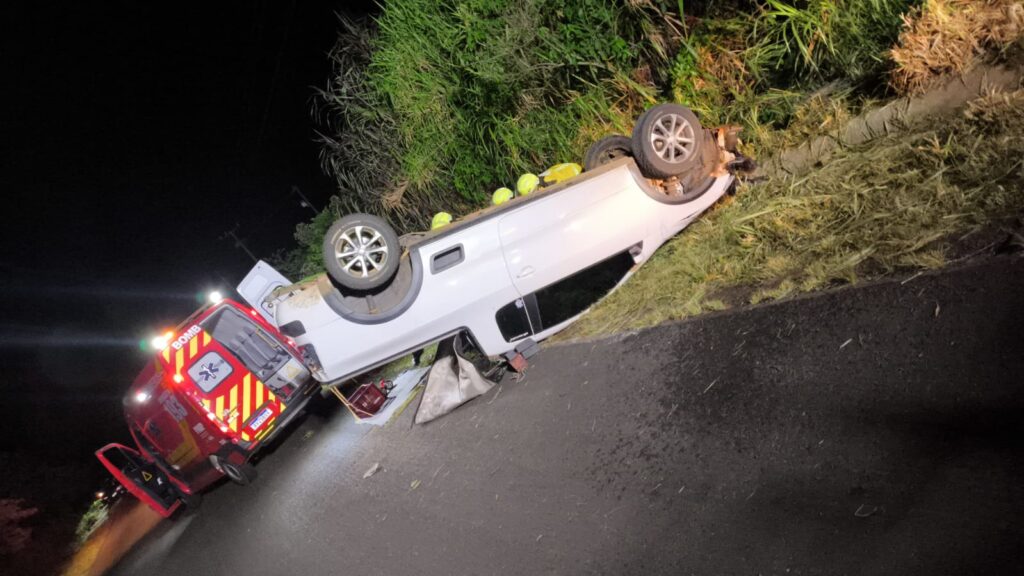 No veículo Saveiro, os bombeiros encontraram um homem adulto inconsciente, sem sinais vitais, parcialmente fora do automóvel e com parte do corpo presa entre o capô e o solo. A equipe realizou a estabilização do veículo e a extração da vítima, que já estava em óbito.