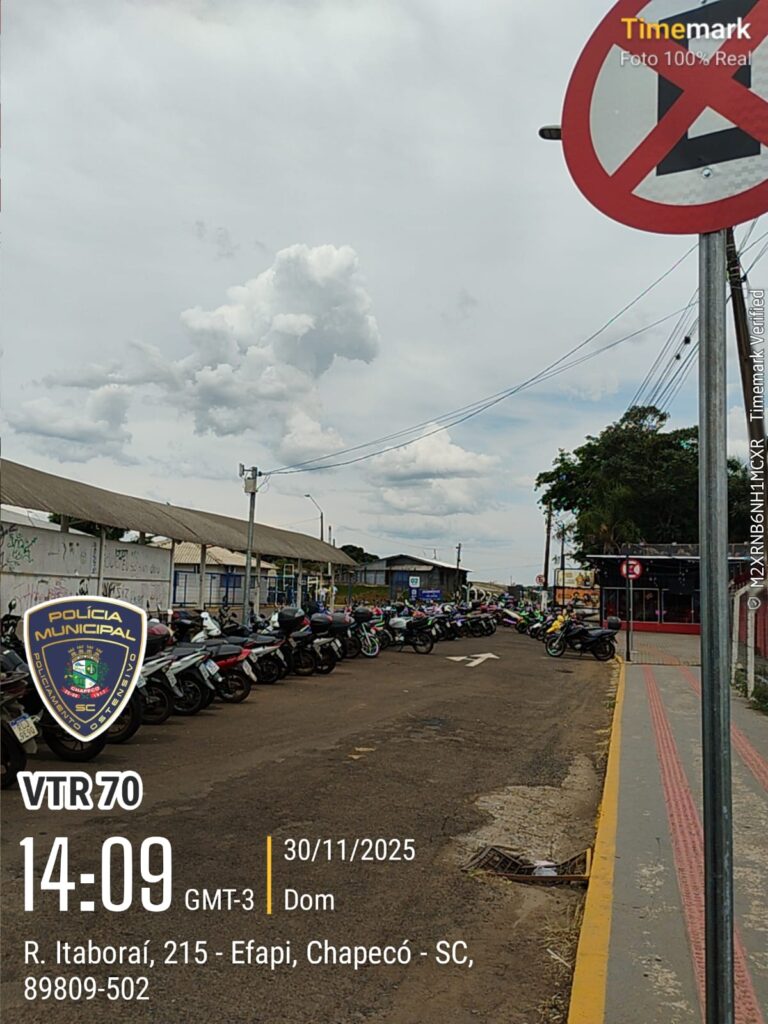 Diversas motocicletas foram recolhidas na tarde deste domingo (30) nas proximidades da Unochapecó, durante a realização de um concurso público. Os veículos, pertencentes a professores que participavam da prova, estavam estacionados de forma irregular, bloqueando a área destinada à conversão e retorno do transporte coletivo.