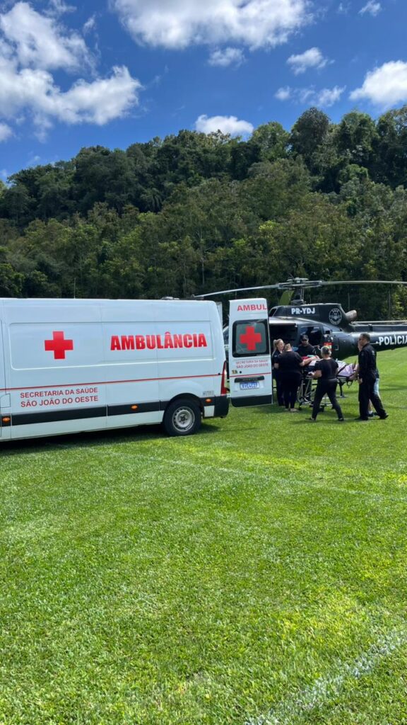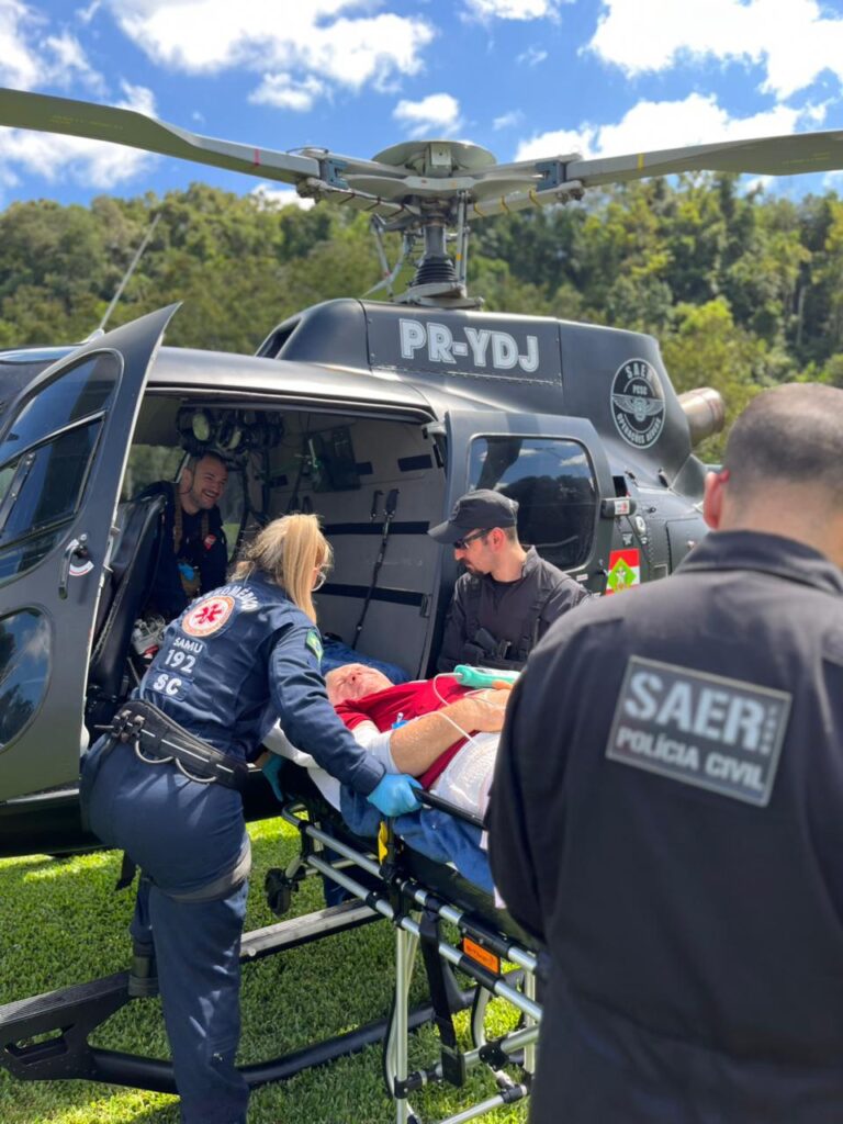 A aeronave da Polícia Civil de Santa Catarina, tripulada por policiais do SAER-Fron e profissionais do Serviço de Atendimento Móvel de Urgência (SAMU), foi acionada para realizar a transferência do paciente do hospital de São João do Oeste para o hospital em Xanxerê.