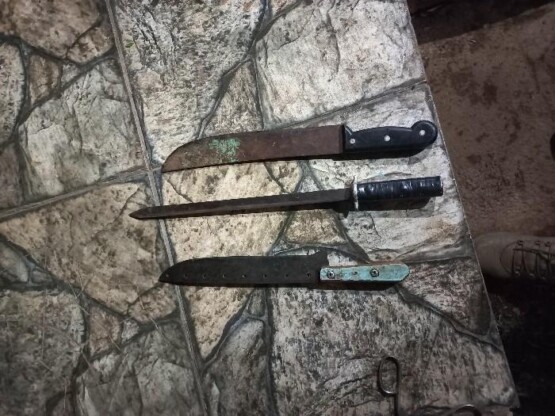 Durante buscas na residência, os policiais localizaram e apreenderam um facão, uma adaga e uma faca. Os objetos estavam sobre o sofá e a cama da casa.