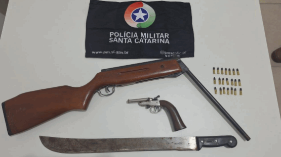Durante buscas na residência do casal, os policiais localizaram uma espingarda calibre 12, um revólver tipo garrucha calibre 22 com duas munições intactas, além de outras 21 munições e um facão. Todo o material foi apreendido.