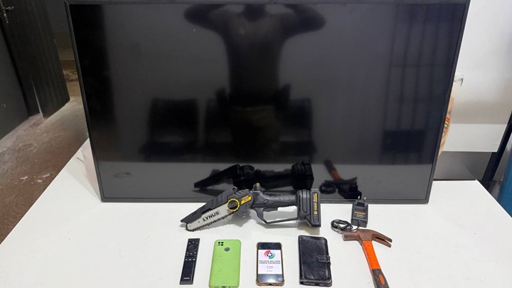 Na revista pessoal, foi encontrado um celular sem identificação aparente. Já no interior do veículo, os policiais localizaram diversos objetos, como um televisor de 50 polegadas, uma motosserra, ferramentas e roupas.