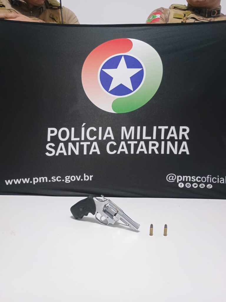 Durante a abordagem, o suspeito confirmou que mantinha uma arma de fogo na residência e indicou onde o objeto estava escondido, atrás da geladeira. No ponto informado, os policiais localizaram um revólver calibre .32, marca Rossi, municiado com duas munições intactas e com a numeração suprimida.