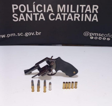 Durante buscas no interior do veículo do suspeito, os policiais localizaram uma munição intacta calibre .38 e um estojo deflagrado. Em seguida, na residência onde o homem se encontrava, foi localizado, dentro de um sofá, um revólver calibre .38 carregado com seis munições intactas no tambor.