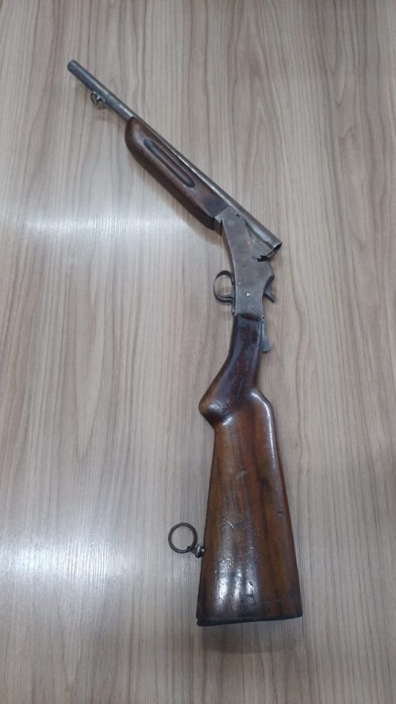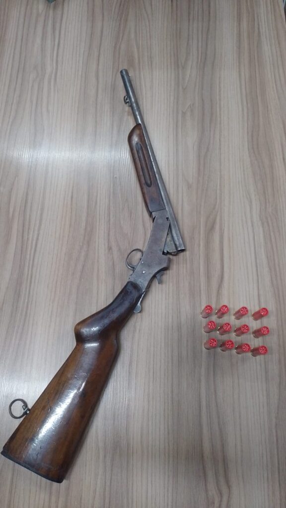 Durante o cumprimento de um mandado de busca e apreensão expedido pelo Poder Judiciário, os policiais localizaram e apreenderam uma espingarda Rossi, calibre 32 GA, além de 12 munições intactas do mesmo calibre.
