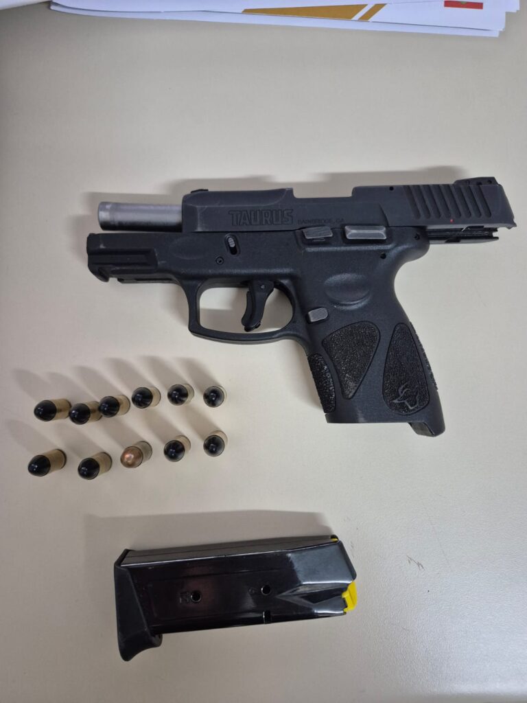 Durante a diligência, os cães de faro localizaram uma pistola Taurus G2C, calibre 9mm, considerada de uso restrito, escondida sob o colchão do suspeito, além de 11 munições intactas. O homem assumiu a posse da arma e confirmou não possuir registro ou autorização legal.