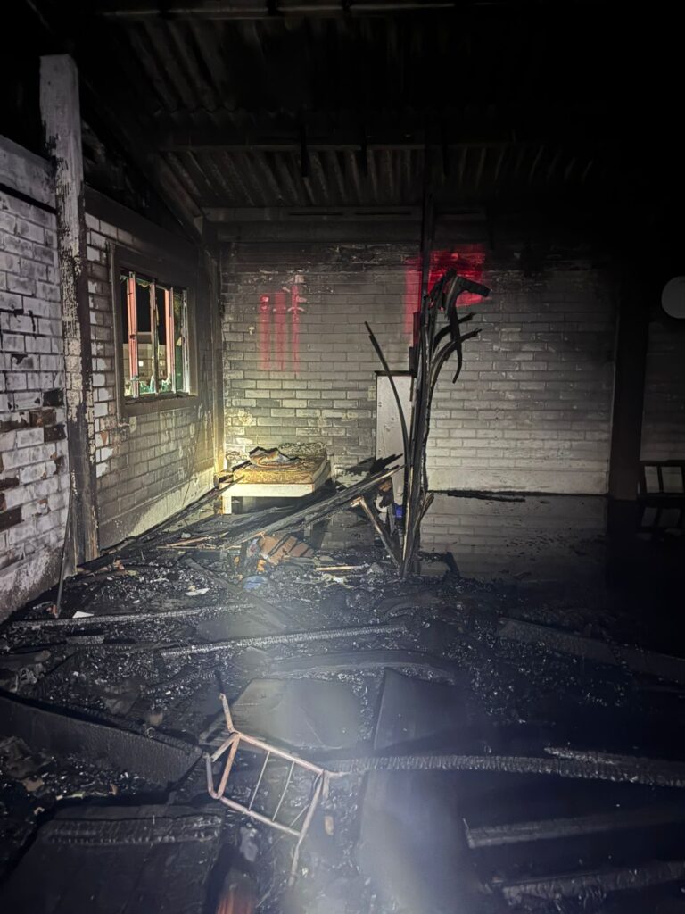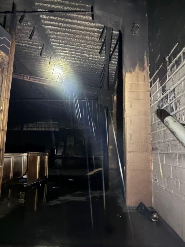 De acordo com os bombeiros, o fogo atingiu o piso superior da edificação, com aproximadamente 400 metros quadrados. No ambiente havia colchões, mesas e divisórias de madeira, o que contribuiu para a rápida propagação das chamas.