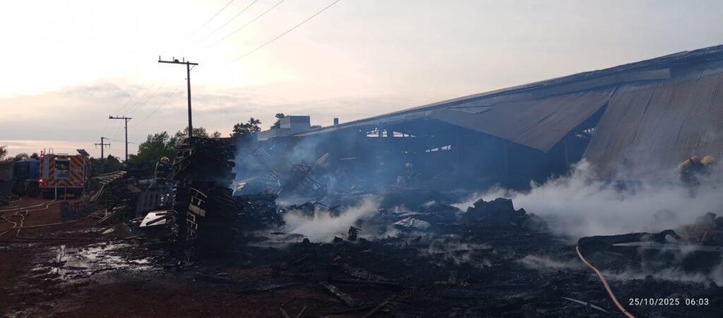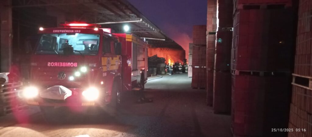 Um incêndio de grandes proporções atingiu, na madrugada desta sexta-feira (24), uma edificação industrial da empresa Cerâmica Floss Ltda., localizada na Rua Fernando de Noronha, Bairro Industrial Pinhal Leste, em Pinhalzinho (SC). O fogo começou por volta das 3h30 e mobilizou equipes do 6º Batalhão de Bombeiros Militar, com guarnições de Pinhalzinho, Saudades e Modelo.