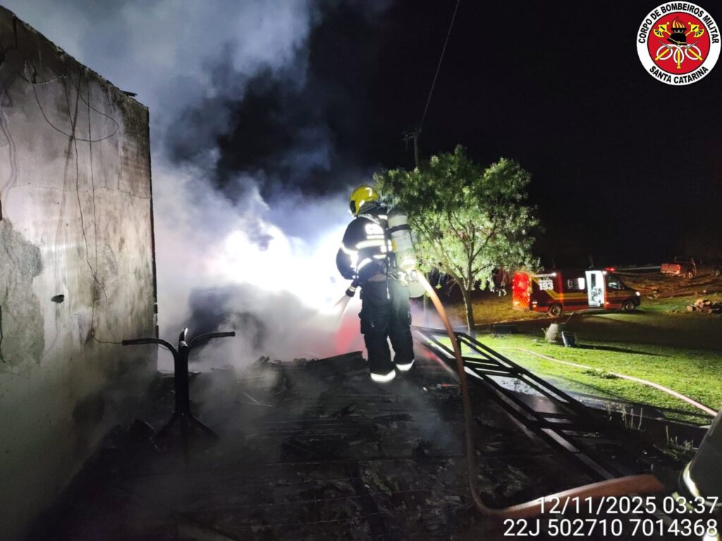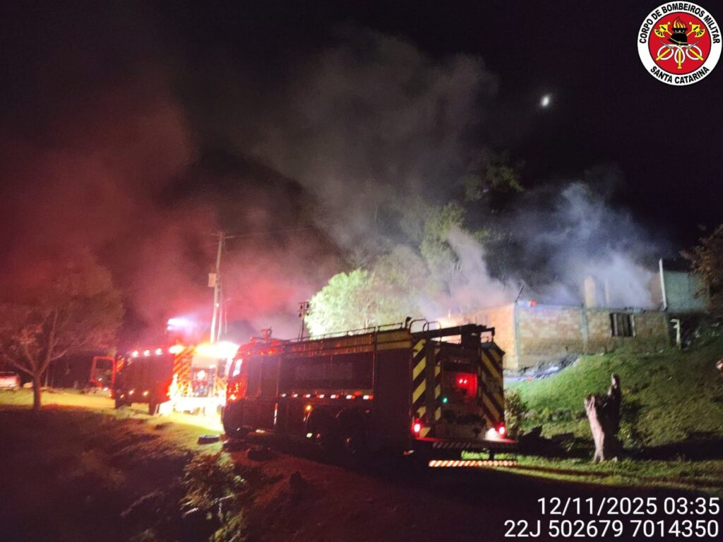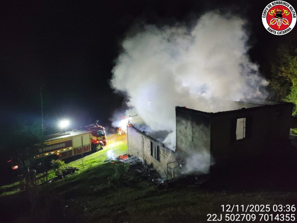 Na madrugada desta quarta-feira (12), um incêndio destruiu completamente uma residência na localidade de Barro Preto, próximo à pedreira da Aterplan, em Fraiburgo, no Meio-Oeste catarinense.