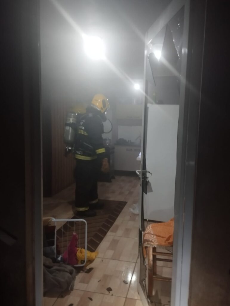 Ao chegar ao local, os bombeiros encontraram uma kitnet de aproximadamente 30 m² tomada pela fumaça. O fogo teve início em uma panela com alimentos que estava sobre o fogão a gás e apresentava chamas ativas.