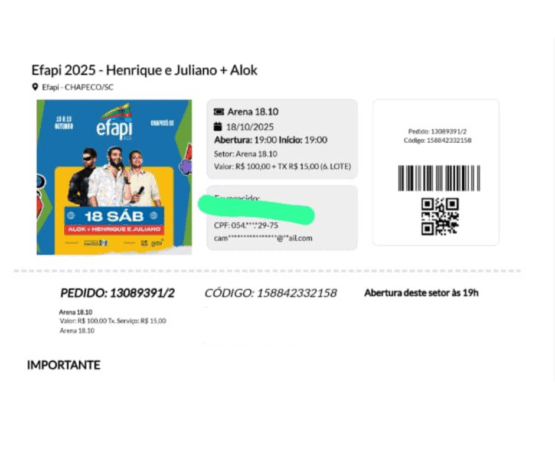 Várias pessoas foram vítimas de golpes de ingressos falsos durante a Efapi do Brasil 2025, que ocorreu de 10 a 19 de outubro em Chapecó. Um casal, leitor do ClicRDC, relatou ter perdido dinheiro ao comprar ingressos falsos para o show de Alok, e Henrique e Juliano. A organização da feira fez uma ampla divulgação dos locais onde os ingressos seriam disponibilizados.