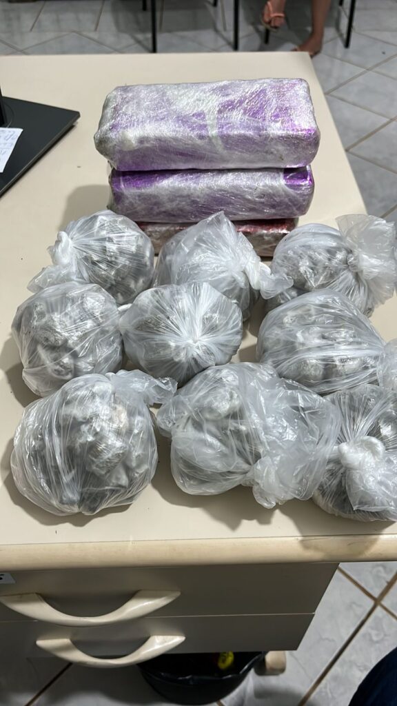 Durante o cumprimento do mandado, os policiais localizaram uma mochila contendo uma grande quantidade de maconha na residência do suspeito, no bairro Esperança. O material estava dividido em tijolos prensados e porções prontas para venda, totalizando aproximadamente 2.150 gramas.