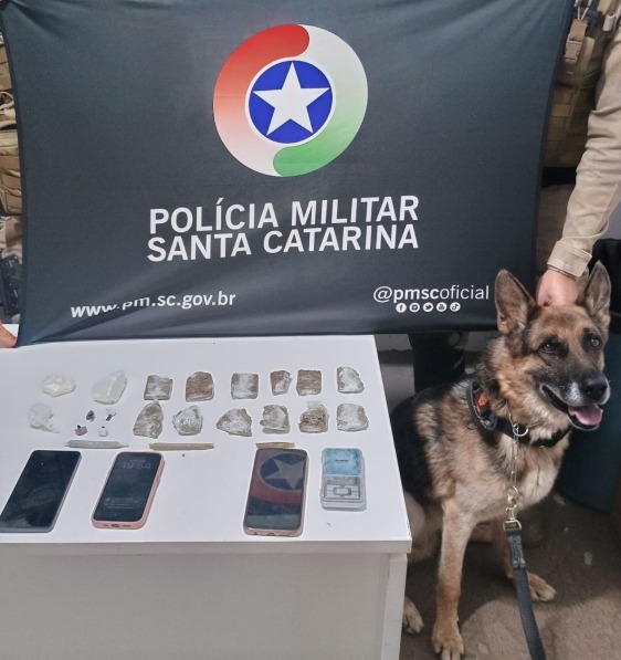 O Canil da Polícia Militar foi acionado para apoio nas diligências. Com o auxílio de um cão farejador, os policiais localizaram o objeto arremessado anteriormente, que continha oito porções de maconha fracionadas, duas porções de cocaína sem fracionar, três buchas de cocaína fracionadas e uma balança de precisão.
