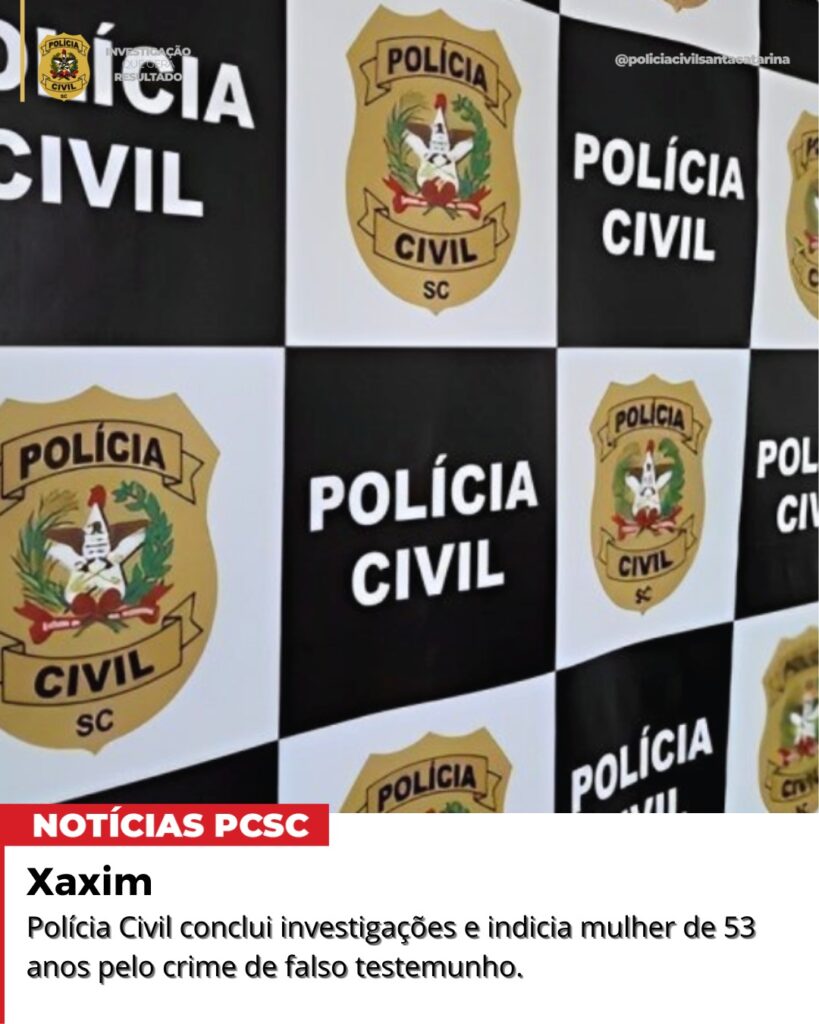 A Polícia Civil de Santa Catarina, por meio da Delegacia de Polícia de Xaxim, concluiu nesta quarta-feira (5) o inquérito que apurou a prática de falso testemunho cometido, em tese, por uma mulher de 53 anos. O caso ocorreu durante uma audiência no Fórum da Comarca, em 26 de agosto deste ano, e está relacionado a um processo que investiga crimes de ameaça e injúria racial contra uma criança de 11 anos.