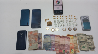 Na sequência, a mulher saiu pela porta da frente da residência e foi abordada. Com ela, os policiais encontraram R$ 107,00 em dinheiro. Em buscas no quarto para onde a suspeita havia se deslocado, a guarnição localizou uma balança de precisão, materiais utilizados para embalar drogas, R$ 6,00 em espécie, 1.005 pesos uruguaios, dois dólares e três aparelhos celulares.